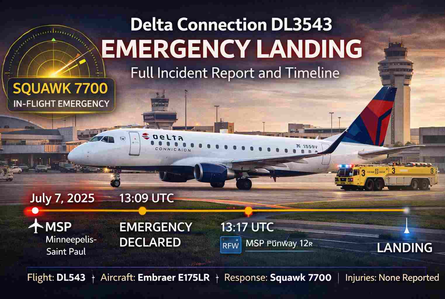 On July 7, 2025, Delta Connection Flight DL3543 declared an in-flight emergency shortly after departing Minneapolis–Saint Paul International Airport. The aircraft turned back and landed safely, with no injuries reported. Here is everything currently known about the Delta Connection DL3543 emergency landing, including the timeline, aircraft details, possible causes, and what the emergency declaration actually means.